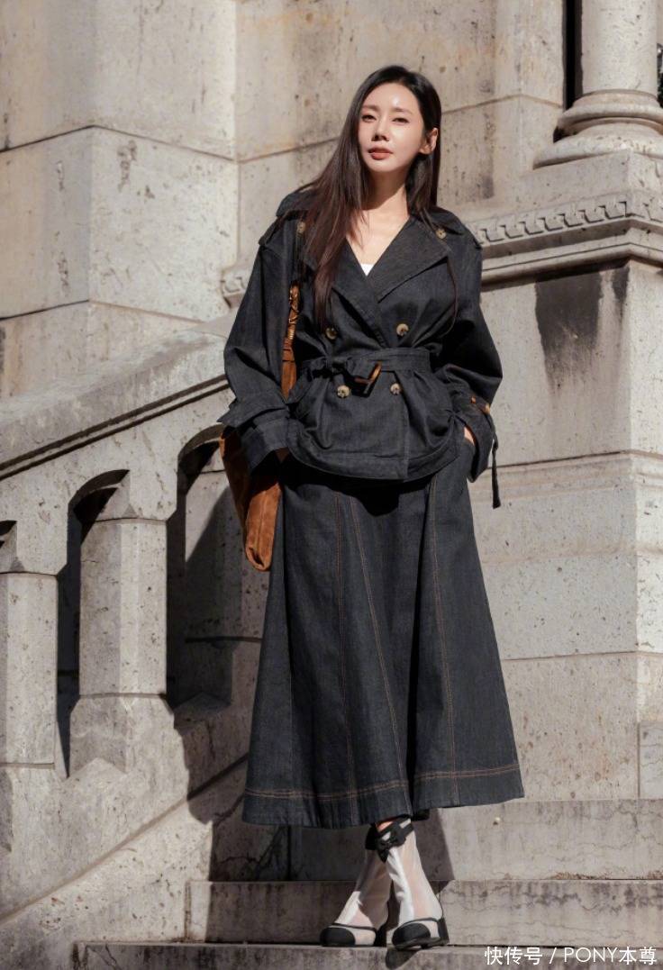 及踝的长度对腿型包容度极高,无论是小腿微粗还是腿型不直,都能被巧妙遮盖;而半裙的版型则保留了女性的柔美,不会像裤装那样利落,反而多了几分飘逸感。与丹宁风衣的硬朗质感形成 “刚柔并济” 的对比,既避免了全身丹宁的沉闷,又让造型层次更丰富。这种 “外套 + 半裙” 的组合,还特别适合秋日的温度 —— 早晚穿风衣保暖,正午脱下风衣,内搭与半裙的搭配也足够精致,实用性与美观度兼备。